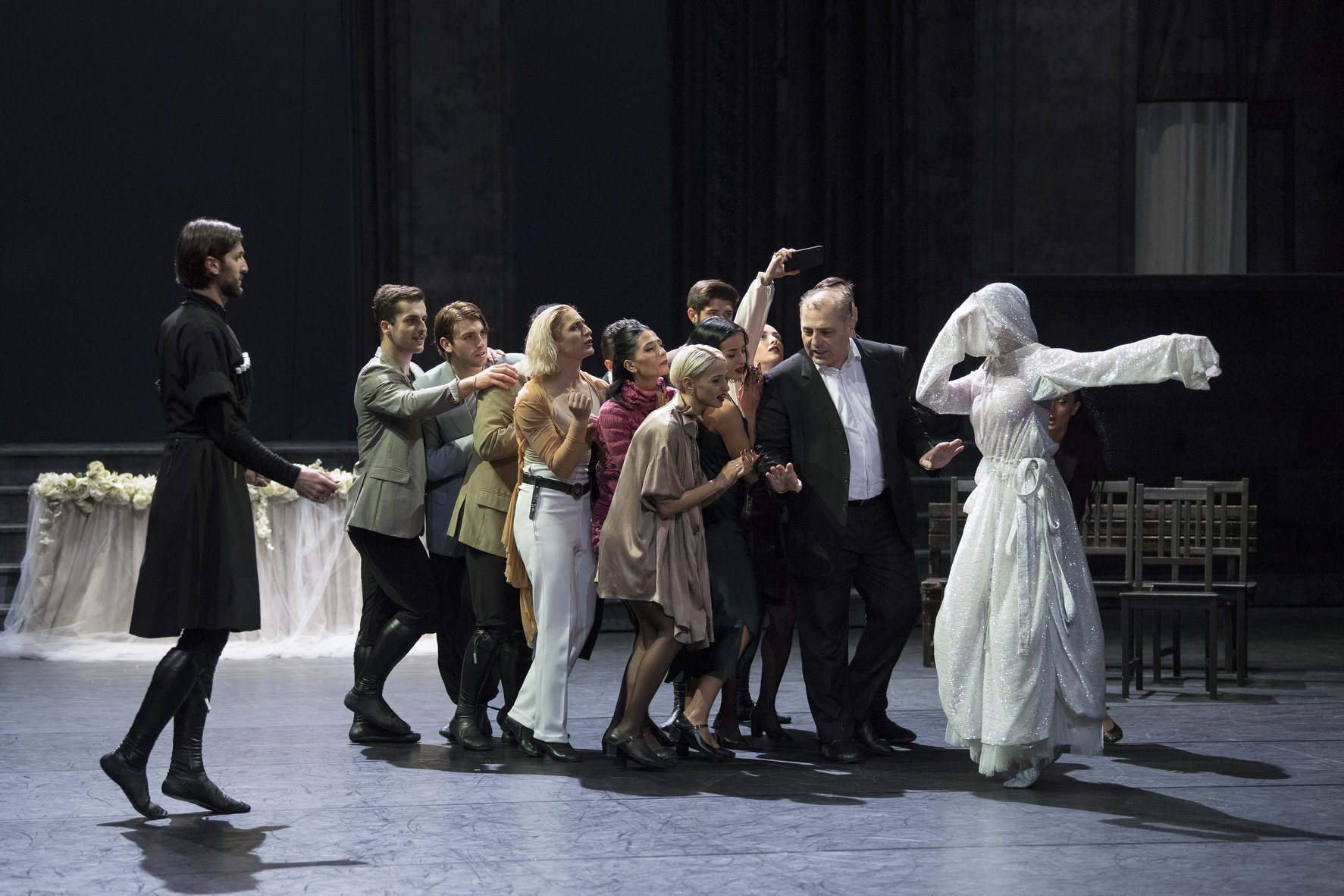 Nous n’aurions du respect que pour l’exploit physique de telles danses où les sauts sont de véritables envols, faisant pâlir les grands jetés des danseurs étoiles. Mais Marry me in Bassiani représente un bond en avant, au-delà des ambitions traditionnelles. Les femmes participent ici au même titre que les hommes, ce qui implique déjà une prise de distance par rapport aux codes. Et la danse n’y est plus un but en soi. Elle s’intègre à une écriture. Elle se dépasse. Pour raconter son pays.