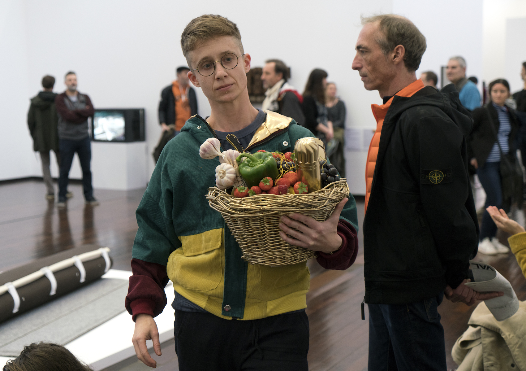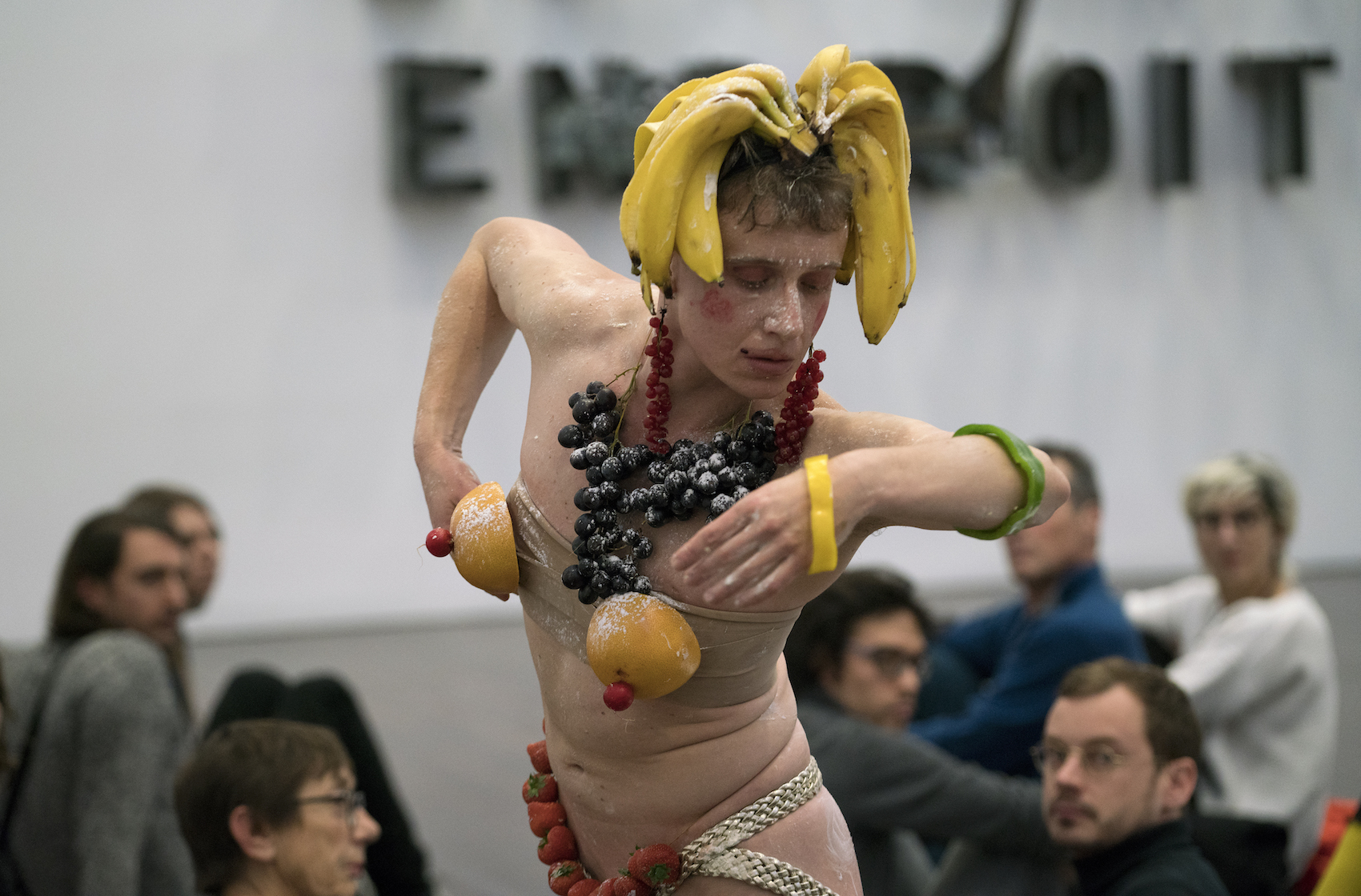 Pol Pi vit lui-même en transition de genre. Cette considération n'a décidément rien qui soit strictement privé, quant il performe Me too, Galatée. Il s'y vit une entrée en fluctuation. C'est une dérive parmi des spectateurs installés ici et là, plus au moins au sol, sans gradin. Certes Pol Pi siège d'abord en piédestal. Mais de là-haut, il puise dans les matières fructifères d'une corne d'abondance pour se composer une configuration féminine d'abord bouffonne, où un régime de peaux de banane vaudra perruque, des agrumes tranchés muteront en seins du plus parfait éclat, et les fruits rouges s'enfileront en ceinture sautillante. Un instant, on songe à la construction coloniale du personnage de Joséphine Baker.
