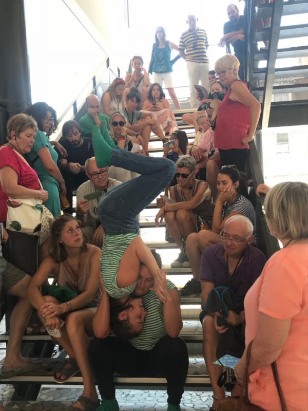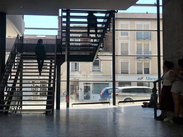 C’est tout aussi vrai pour le Duo d’escalier avec Camille Fauchier et Laëtita Vieceli qui mènent la Compagnie Née d’un doute. Presque une création et surtout, un spectacle in situ qui change radicalement avec la cage d’escalier et le bâtiment ou l’immeuble qui l’accueille. A Périgueux, Fauchier et Vieceli ont investi un hall d’accueil semi-public, doté d’un grand escalier central. Monter les marches y revenait à tamiser les corps comme derrière un store vénitien. Les textes diffusés par casque révélaient alors les détails, à l’intérieur comme à l’extérieur, de l’environnement architectural et urbain. Une inscription par-ci, une statue par-là, en jouant avec ceux qui passent dans la rue...