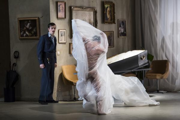 Avec ses murs de béton, sa baie vitrée intérieure fermée par des rideaux gris, ses tableaux sans âme, sa machine à café, et sa plante verte, on se croit au début à un guichet quelconque. Mais derrière la vitre, apparaît bientôt la mère, exposée dans son cercueil. À partir de là, tout vacille, et nous voilà entraînés dans une sorte de vortex d’où surgissent des bribes de rêves, des scènes enfouies, des souvenirs écrans, des images trop réelles pour être vraies ou trop folles pour être fausses. On y trouve des phrases appelées à devenir culte « Il y a dix ans ma mère est morte, et ma première femme il y cinq ans, ma deuxième femme récemment et maintenant, la machine à café ! » Personnage à part entière, elle est « machine désirante » dans cet univers où l’obstétricienne à des bras à rallonge, et la femme de ménage lave un homme nu. La gestuelle est violente, explosive, d’une rapidité à couper le souffle, où d’une drôlerie à mourir.