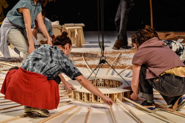 Mais s’il fallait passer par là pour arriver au tableau final, alors soit. Car celui-là fait sens en tant qu’acte de proposition. Dans La Maisonnée, l’équipage sort une brouette, transporte du blé ou des lentilles. Mieux, ils commencent à assembler une roue et de multiples perches. Et là, il ne peut s’agir que de la toiture en devenir d’une nouvelle yourte ! C’est donc tout un mode de vie, actif et solidaire, qui se déploie sur scène, où l’on ne danse pas mais se laisse bercer par les sons d’une cornemuse. Et on y construit des épouvantails, sans doute en guise de rempart contre les mauvais esprits judiciaires. Les gestes ont une finalité, l’acte performatif enchante. Il le ferait encore davantage s’il n’y avait pas cette voix off mécanique qui énumère sèchement « l’enfance, la joie, la lumière, la magie, l’écologie, le patriarcat, la famille… » comme on ferait une liste de courses. La vie en yourte, on l’a compris, propose tellement mieux…
