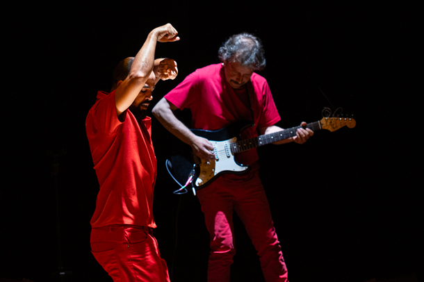 Taoufik Izeddiou : Pendant la pandémie, je suis tombé sur une citation : « Le monde est en transe ». Et c’est ce qu’on pouvait observer tous les jours ! Il y avait comme une grande performance qui arrivait au monde, où beaucoup de gens s'inventaient des choses improbables pour se protéger, pour éviter que quelqu’un les approche. Ou bien ils réalisaient des gestes étranges. Un tel portait des CD sur lesquels il avait copié des antivirus. Tel autre coupait une orange en deux et l’utilisait comme masque. Tel autre allait dans le métro avec une ventouse pour ne toucher à rien. Il y avait comme une grande arrivée de la performance ! Le monde était en transe et j’ai pensé à la phrase « je vous demande d'arrêter le monde, je veux descendre ». A partir de là, j’ai commencé à travailler par internet avec les danseurs qui étaient tous à Marrakech et nous avons créé cette première pièce, Hmadcha. Après, il y avait la nécessité de prendre du temps, et j’ai pu créer le duo Hors du monde pour le danseur Hassan Oumzili et Mathieu Gaborit aka Ayata à la guitare électrique. Il fallait aussi que la question de la transe parte sur d'autres corps parce que Hmadcha est porté par des gens du Sud uniquement.