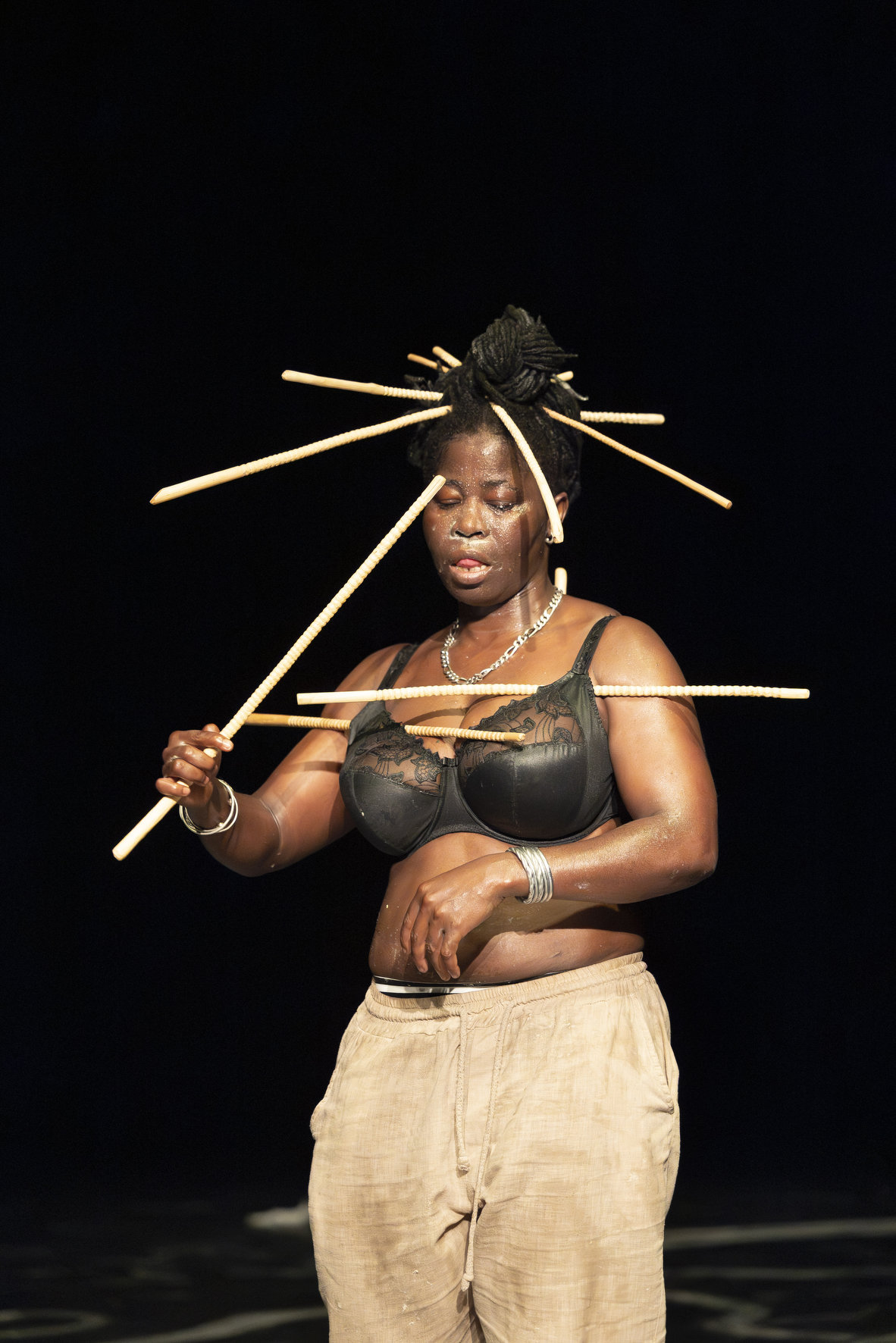 Le spectacle se décline à la manière d’un rite d’initiation. « C'est un rituel avec des gens. Pour moi, toute la salle, c'est Yikakou. » A cette salle, elle s’adresse aux côtés de Charlotte Dali, chanteuse principale du groupe abidjanais Les sisters du zouglou et Salimata Diabaté, l’une des très rares femmes à jouer du balafon et des percussions au Burkina Faso. Et ce balafon, elle ne l’a pas laissé à Ouaga ! Nadia, la beugresse en cheffe, sort un tout autre instrument. C’est l’ahoko, un bâton musical blanc, à jouer presque comme un instrument à cordes. Elle en a amené des dizaines, pour s’en construire une couronne, un costume, une armure…