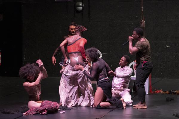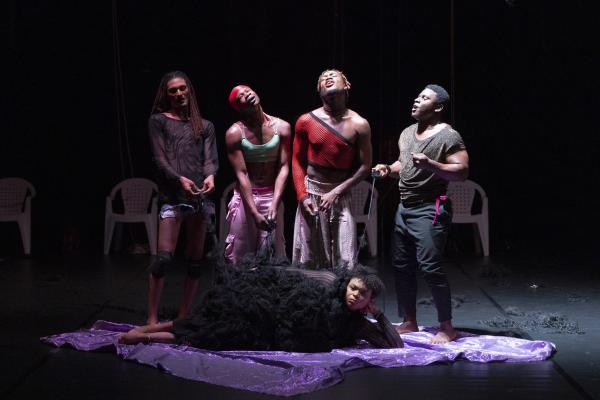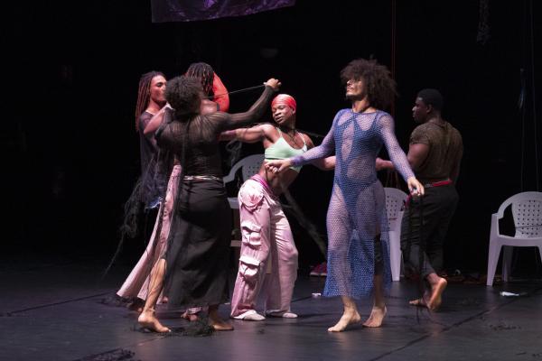 Ilselles, donc : Prennent place dans des chaises en plastique et écoutent le Boléro de Ravel sans bouger ou presque, mais avec une présence scénique dévorante. Et se transforment petit à petit en une meute de chiens qui fait frémir plus d’un dans la salle. Ces chiens sont sans doute ceux des rues d’Abidjan, mais aussi les chiens de garde qui agressent leur communauté. La scène est l’endroit de retourner le bâton, d’exorciser une part de ce qu’ilsellesendurent au quotidien, d’assumer des fantasmes comme celui de s’emballer de coton noir pour incarner un être mythologique ou de transformer un chewing-gum blanc en string pour en affubler son visage.