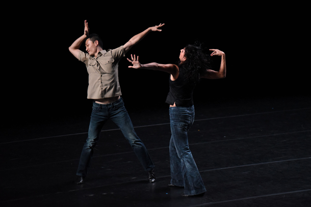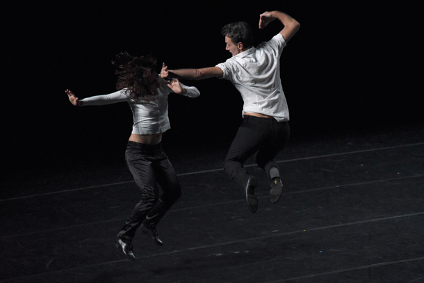 Certains titres, bien sûr, résonnent plus que d’autres. Comme ce paradoxal duo en silence - un problème de droits d’auteur - consacré aux Beatles, à charge pour les specateurs d’imaginer en fond sonore le titre de leur choix. Ou bien ce pas de deux masculin sur le Sunday Morning de Lou Reed et du Velvet Underground. Et cette évocation de l’Iguane, Iggy Pop, où un danseur solo aligné face au groupe est peu à peu relayé par les autres, dans un fluide passage de relais. Cette séquence d’ensemble est l’une des rares de la pièce, qui se compose principalement d’une succession de duos. C’est là sa signature, élégante et légère, c’est peut-être aussi sa faiblesse. On aurait aimé, en effet, que la force collective et l’effet de masse du rock’n roll, si bien décrites lors des interludes par Gallotta lui-même, s’expriment elles aussi dans la chorégraphie. La réussite des trois ou quatre ‘chorals’ mobilisant l’ensemble de la troupe fait encore plus regretter ce parti-pris.