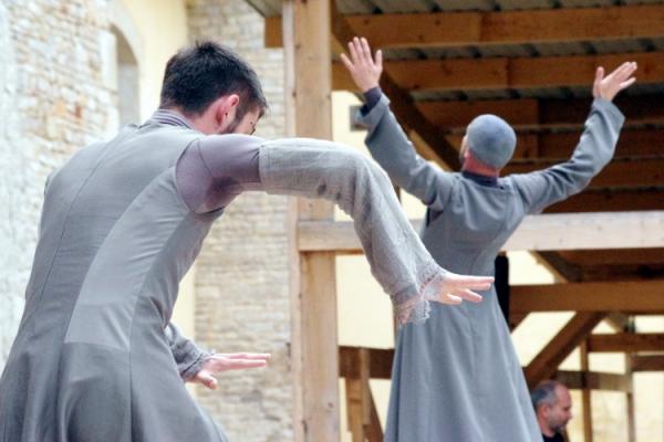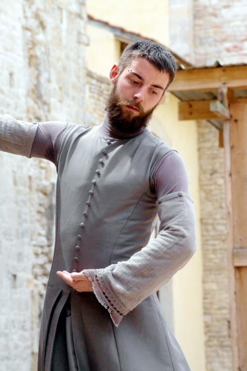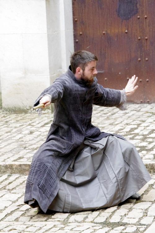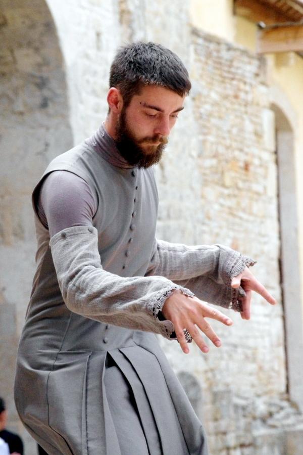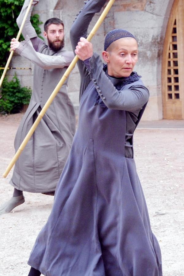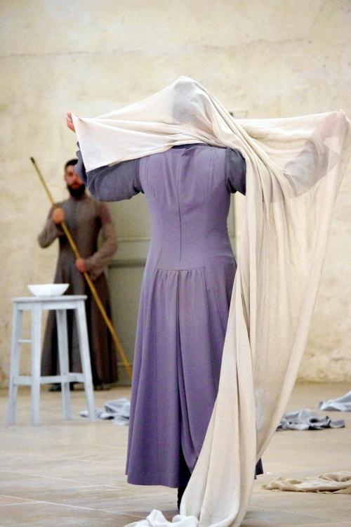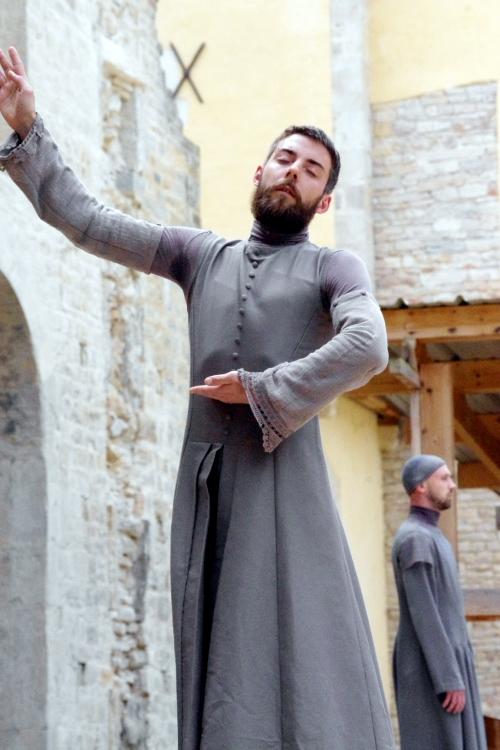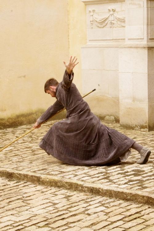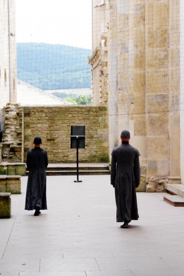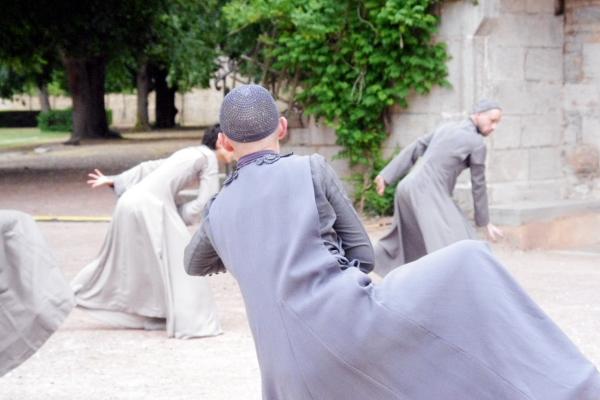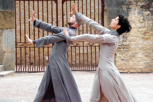 Habillés dans des tons qui rappellent tout autant les murs clunisiens que les robes de bures, se détachent du paysage, baignés d’une lumière crépusculaire (le spectacle commence à 21h, « entre chien et loup »). La gestuelle, extrêmement concentrée, passe de l’immobilité au mouvement presque subrepticement, rappelant même à certain moments, la minéralité suivie de fulgurances d’arts martiaux extrêmes orientaux.