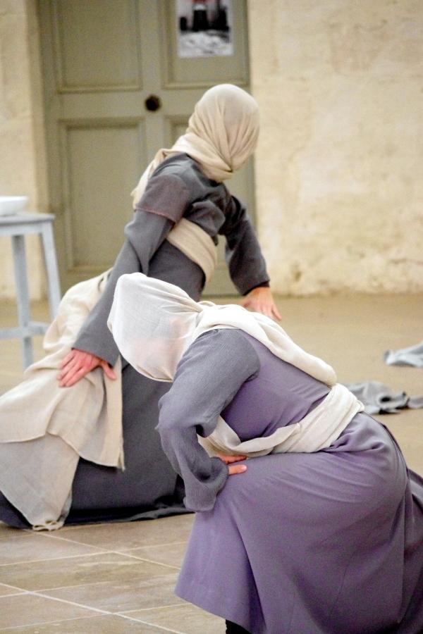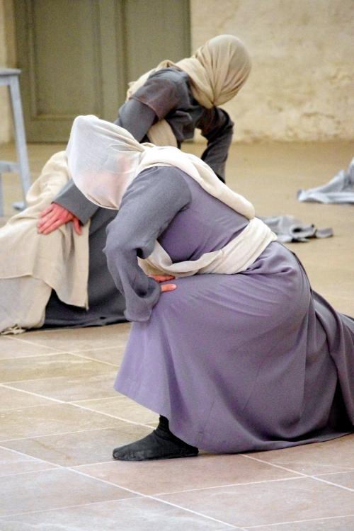 Le fait même de considérer les corps dans cette architecture en magnifie le volume et provoque des sensations très particulières, comme celle de se sentir happé vers le haut par la voûte du clocher de l’eau bénite, de respirer la sérénité du cloître, de mesurer le solennel couloir. Du cloître au farinier, se tisse peu à peu une histoire dansée peuplée de formes qui surgissent et s’estompent.