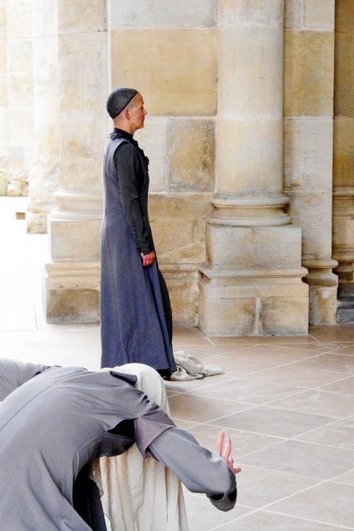 Pourtant, dans ce contexte très chargé d’histoire (n’oublions pas que la Basilique abrite les vrais gisants des rois de France), il a fallu donner tous les gages d’une bonne tenue. « La danse étant toujours un peu suspecte, raconte Simon Pons-Rotbardt, programmateur de ces Monuments en mouvement, et charrie avec elle des peurs liées au débordements des corps, à la nudité notamment. J’ai assuré aux représentants du clergé que je voulais pas provoquer, mais au contraire, redonner à ces lieux toute leur puissance spirituelle ». Pour preuve, les danseurs de Nathalie Pernette sont habillés jusqu’au cou. La seule chair visible sont les mains et le visage. À tel point que « rencontrant des religieuses en visite dans l’abbaye, nous étions si semblables dans nos costumes, que nous avons été surprises et nous nous sommes saluées » s’amuse Nathalie Pernette.