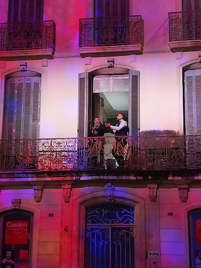 La première extension est un concert « au balcon ». Dans la fraîcheur d’un début de soirée de janvier, on se rend devant le Théâtre Bernadette Lafont dont la façade surplombe la petite place de la Calade. En face, un immeuble historique avec ses balcons et ses garde-corps en fer. Sur le balcon central, le chanteur Alberto Garcia et le guitariste Juan Manuel Cortés entonnent bulerías et seguiryias, si bien que l’hôtel particulier ne fait plus face au théâtre mais de fait s’y intègre. Et avec lui la place toute entière. Au triomphe complet ne manque qu’une petite chose, à savoir les températures sévillanes. L’architecture, elle, est digne de toute cité taurine.