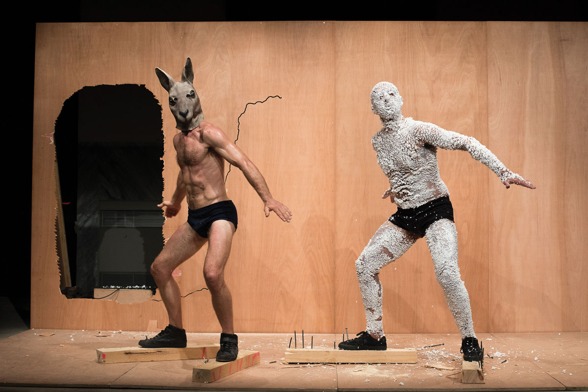 Un univers très différent est celui de Claudio Stellato, maître du bricolage absurde, décalé et chorégraphique. Dans Work_17, il envoie quatre danseurs dans un rituel aussi mystérieux que grotesque, autour du bois, de la peinture et des clous. Lui répondent les quatre contorsionnistes bûcheronnes de la compagnie anglaise Reckless Sleepers, qui scient des chaises à la manière d’un quatuor à cordes.