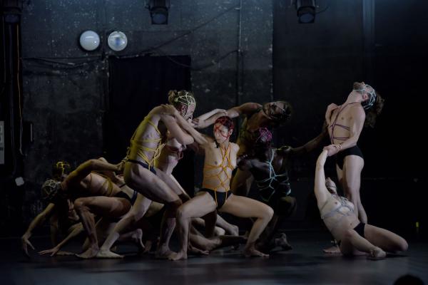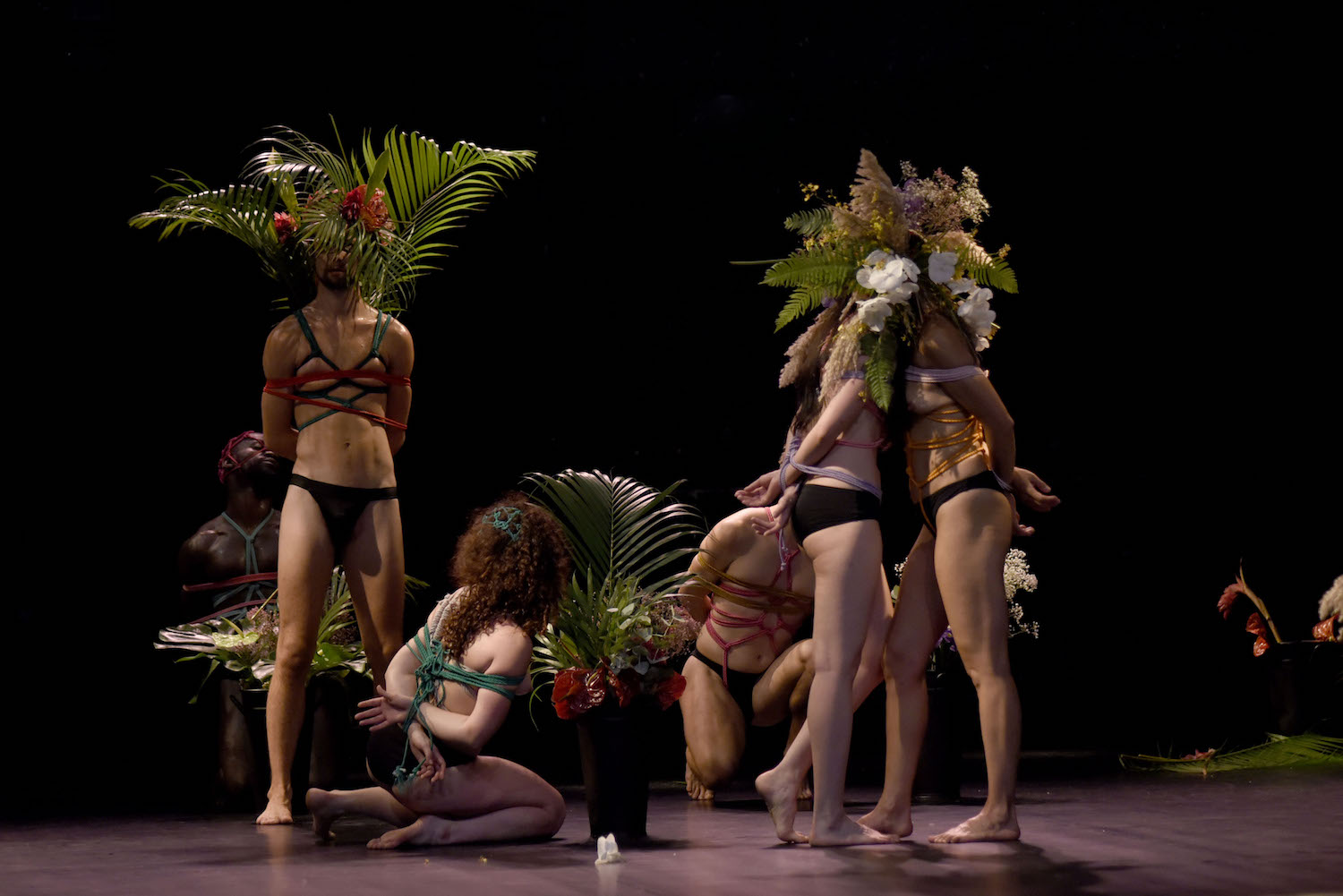 Ainsi, quand le public entre, les onze interprètes occupent déjà le plateau depuis près de deux heures, comme si la représentation ne faisait que poursuivre le rituel qu'ils suivent, s'attachant les uns les autres selon les préceptes et indications laissés par Fabio Da Motta. Ce plasticien brésilien qui mêle shibari et art floral, pour cause de restrictions de voyage, ne peut pas participer au spectacle. Il a donc transmis aux danseurs et à Dorothée Sullam, l'artiste fleuriste présente au plateau, l'art complexe du kinbaku (autre façon de désigner ces pratiques)…