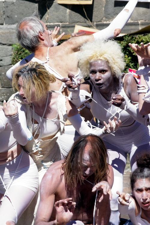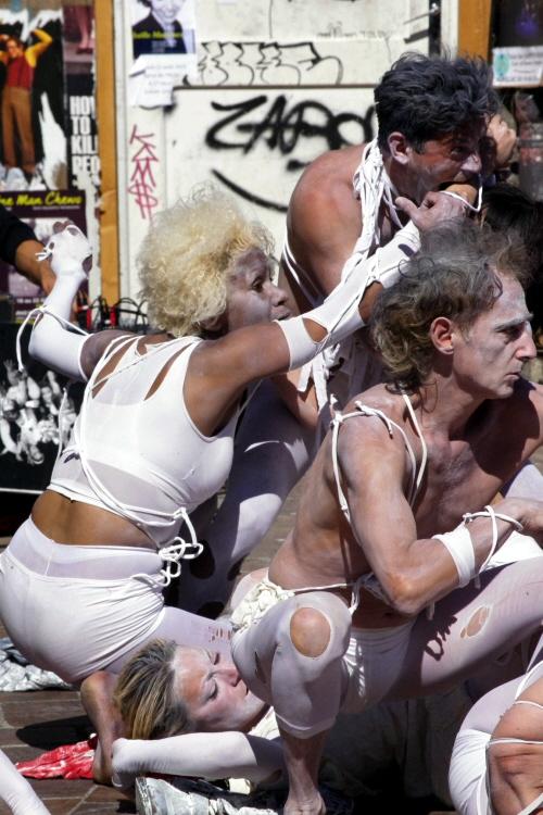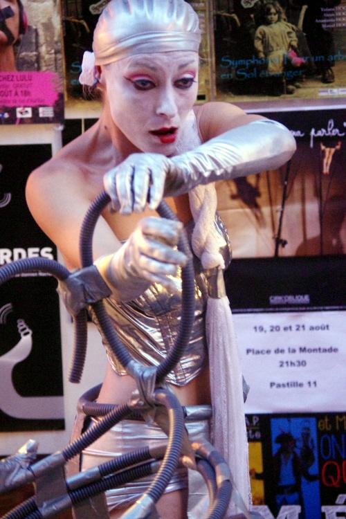 Juste après, on verra l'une des interprètes de Re-United Now-Here, Karakori Ai alias Corinna Torregiani. À Aurillac, elle n'a pas hésité à affronter la rue dans les conditions les plus dures qui soient, au hasard d'une rue, sans même disposer d'un espace-scène aménagé ou défini. Sa présence n'en fut que plus intrigante.
