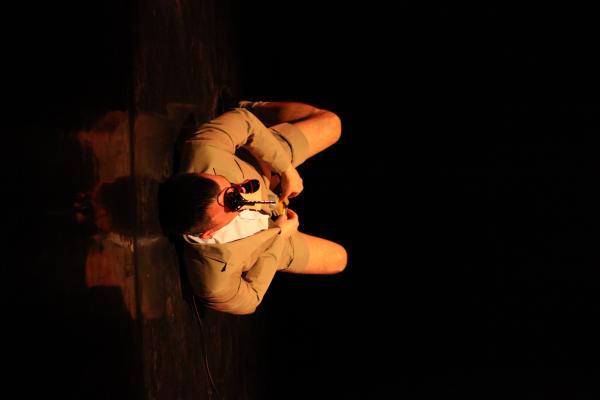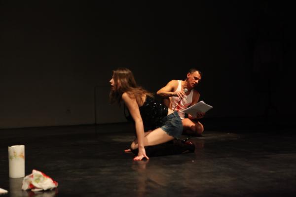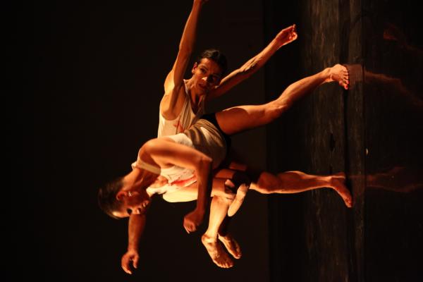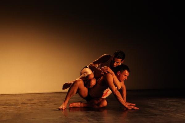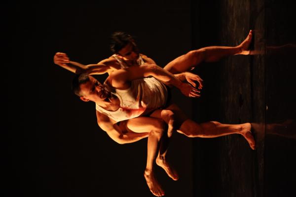 Ici, il s’agit plutôt d’une traversée du monde homosexuel de ces dernières années, vu par les artistes brésiliens et pluridisciplinaires que sont Biño Sauitzvy et Nando Messias. Ils posent la question d’une société qui peine à accepter les différences, mais plus encore, la question du paria au sein même d’une minorité donnée. Il y a des images fortes, celle du sang qui coule de leurs bouches, des mots forts comme cette phrase sur les rencontres dans les “bains” où chacun est jaugé “en fonction de ses muscles, de la taille de ses attributs et de la rondeur de ses fesses”, des gestes forts comme ce baiser dans l’ombre ou ces portés aériens mais horizontaux.