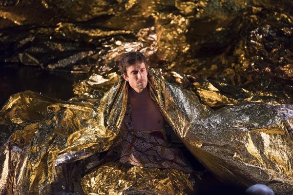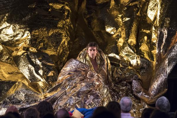 Dans un télescopage saisissant, le papier doré dont s’entoure Sa Majesté devient la mer déchaînée où sombrent les nouveaux boat people et la couverture de survie des rescapés. Le miroir, version réduite de la Galerie des Glaces dans lequel se contemple Benjamin Pech au début du spectacle, finit par refléter, dans un écran situé au-dessus du plateau, le chaos des zones de non droits contemporaines. Quant à son survet’ kitch et débraillé, il ressemble à la tenue disparate de migrants habillés au hasard des stocks de vêtements.