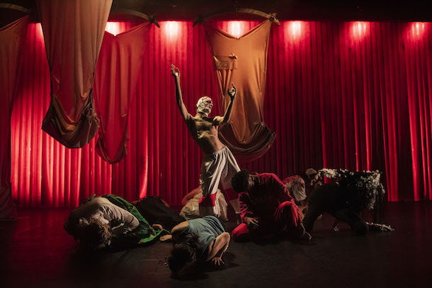 Très théâtrale, la pièce d’Oona Doherty repose beaucoup sur le récit autofictionnel, construit autour du « mythe personnel ». Voici donc le petit Edward devenu Speck installé chez les tantes Clark elles-mêmes « fairy twins » ou jumelles féériques qui l’envoient bosser à l’abattoir. Dans ce monde où l’on passe de vie à trépas, où la mort et le sang sont l’ordinaire et l’odeur insupportable, Specky doit survivre et n’a que la danse pour mode d’existence. Quand arrive Halloween (Samhain), le cochon qu’il a tué ressuscite…