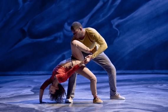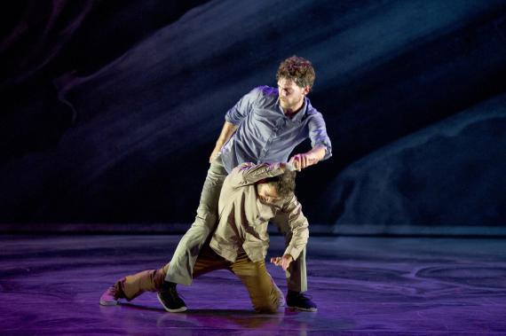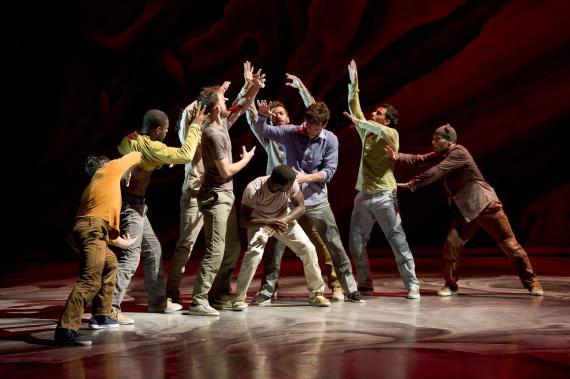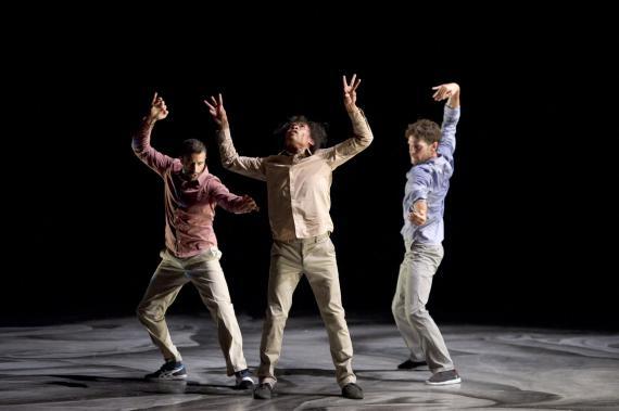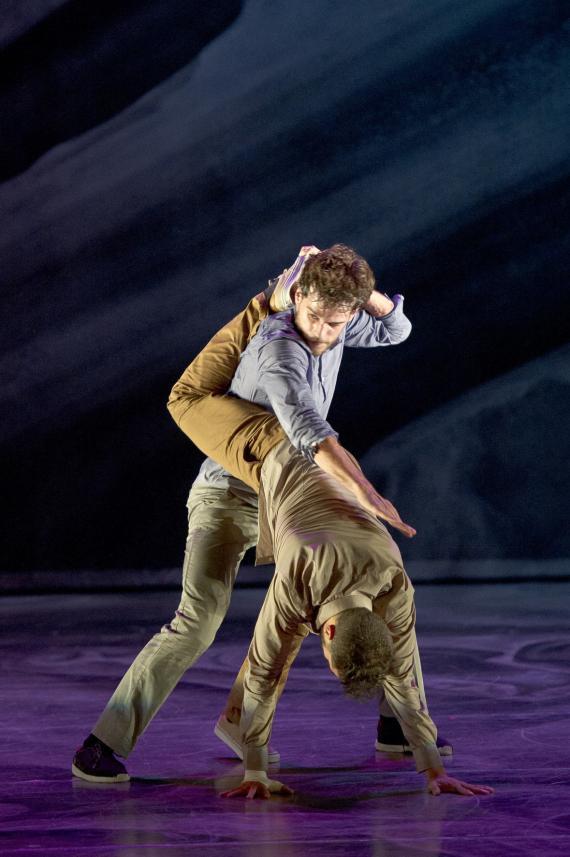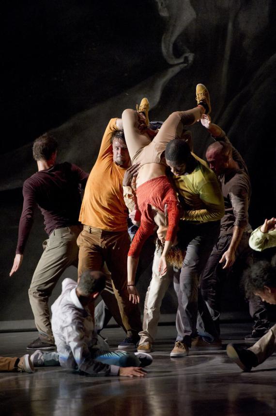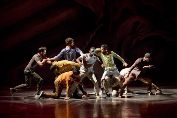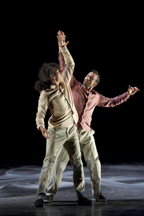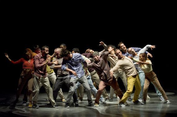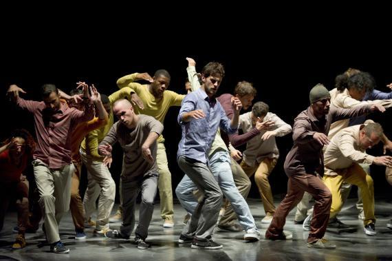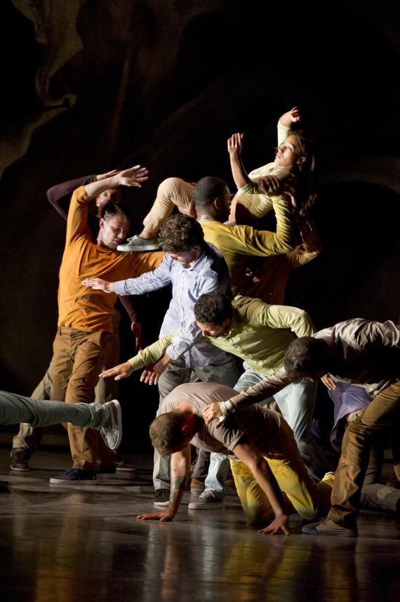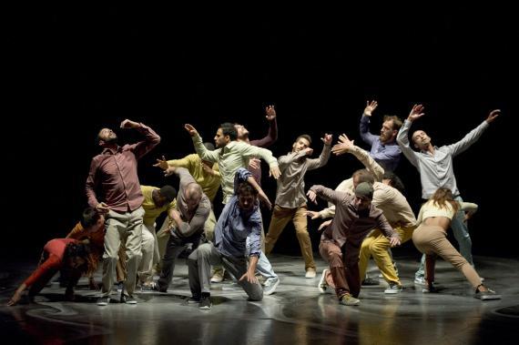 L’attention portée au rythme est une composante essentielle de ce spectacle qui pulse l’énergie, la puissance de la danse, et des moments d’attentes comme autant de doutes ou d’émotions rentrées, il y a des courses, des avancées et des poses épaules contre épaules, nous rappelant que ces danseurs incarnent parfois une humanité en marche. Avant de repartir de nouveau plus haut, plus fort, dans des exploits acrobatiques à toute vitesse, dans des mouvements à la mécanique complexe et des unissons à trois, à quatre ou à seize. On passe de duos d’une vélocité extrême à des hésitations du corps, un solo presque titubant tandis qu’émerge de la bande-son aussi matiérée que la toile de fond, la voix de Caruso dans la romance de Nadir des Pêcheurs de perle de Bizet, sur lequel s’achève d’ailleurs le spectacle, comme un songe passager.