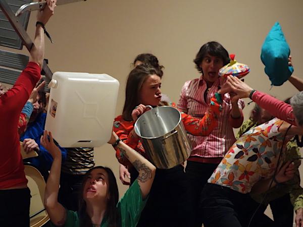 Dans l’immense grenier repeint en blanc et vidé de tout mobilier ou accessoire superflu, ont pris le relais des solos, pas de deux ou de plus, des actes théâtraux, pour ne pas dire « performatifs », des monologues absurdes, des actions de groupe, des invitations et incitations participatives, certaines d’entre elles affichant clairement les consignes de leur auteure.