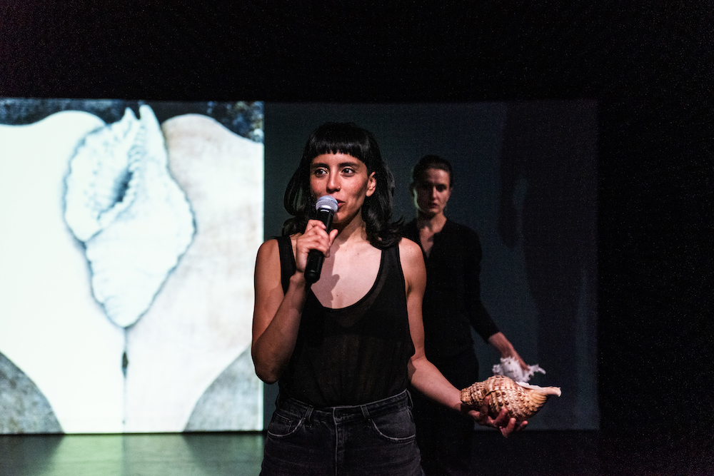 La concha-coquillage peut donc rappeler la vulve, mais aussi l’oreille (démontré en début de spectacle, dessin anatomique à l’appui) et on en déduit que l’appel à écouter avec sa « conque » peut donc s’adresser à tou.t.es, gent masculine incluse. Il suffit d’ouvrir ses sens et à ne pas fermer ses oreilles aux points de vue des femmes. L’humour fin et espiègle de Belhôte et la présence poétique et subtile de Santander Corvalán tissent les fils d’une traversée subjective et enrichissante d’une histoire de l’art, occidentale et donc chrétienne – ce qui veut dire masculine – dans laquelle les femmes revendiquent leur juste place à partir du XXe siècle. Et puis, comment mieux ouvrir L’Année commence avec elles qu’avec ce tour d’horizon à partir de la concha ?