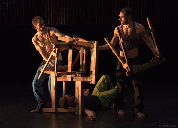 Alors qu’au fond du plateau, un mur fait de tôles ondulées reflète des vidéos, trois danseurs athlétiques se déploient avec une souplesse et une lenteur qui fait songer à des plongeurs sous-marins, sauf qu’ils ne sont pas dotés de bouteilles emplies d’air. Ils nagent comme des otaries, jouent entre eux et expriment une intense liberté du corps à se mouvoir comme ils veulent. Par moment l’un ou l’autre passe sous le décor afin de prendre un peu d’air pour mieux replonger ensuite et rejoindre ses copains. Nous sommes dans un milieu aquatique où rien n’est violent ni agressif. Il y règne une certaine forme de paix et de respect.