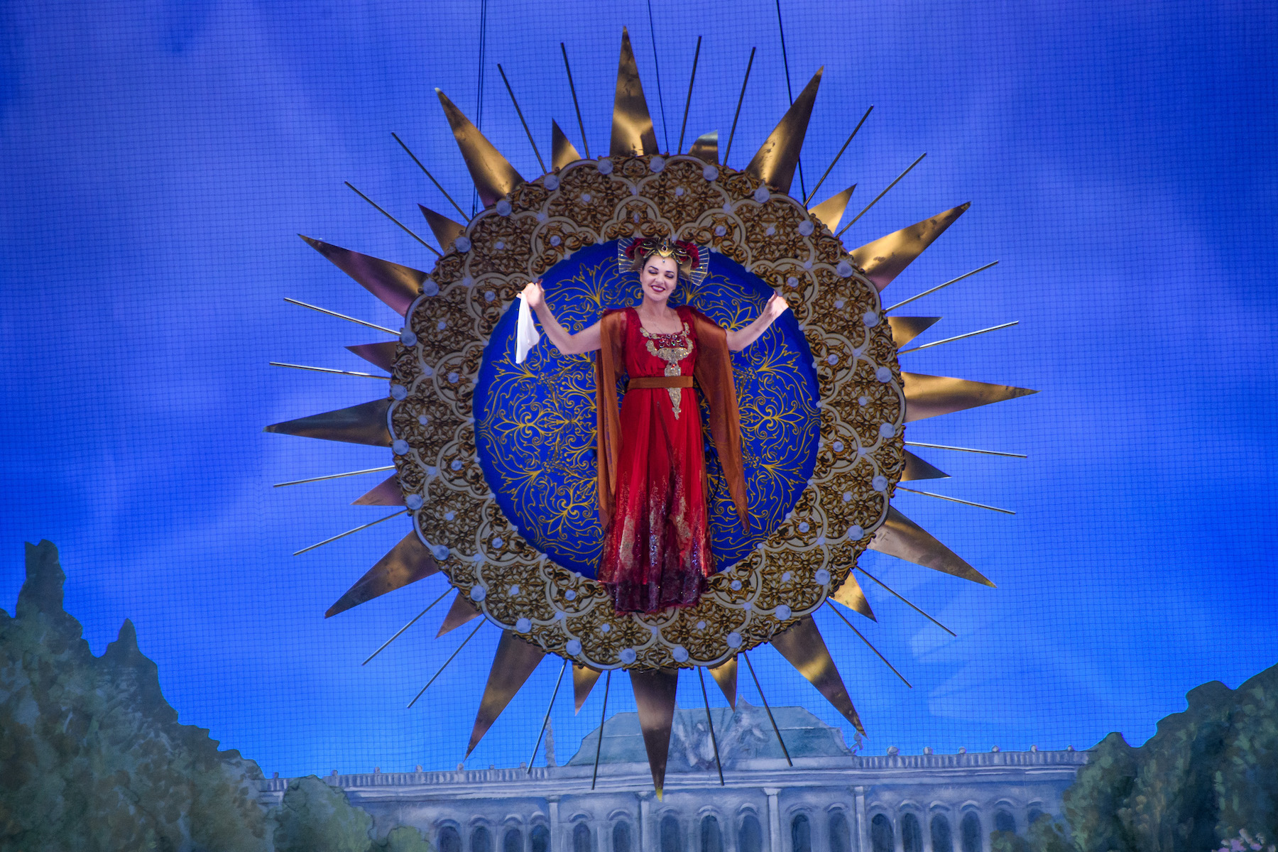 A la fin du premier acte arrivent les deux amants. L'Impératrice les accueille et touchée par leur amour décide de les marier. S'ensuit une scène d'opéra chanté avec l'Ode à la gloire d'Anne superbement interprété par la soprano Anna Netchaeva, soliste du Théâtre Bolchoï. Dans la pure tradition du théâtre baroque, elle flotte, suspendue en l'air au centre d'un soleil éclatant .