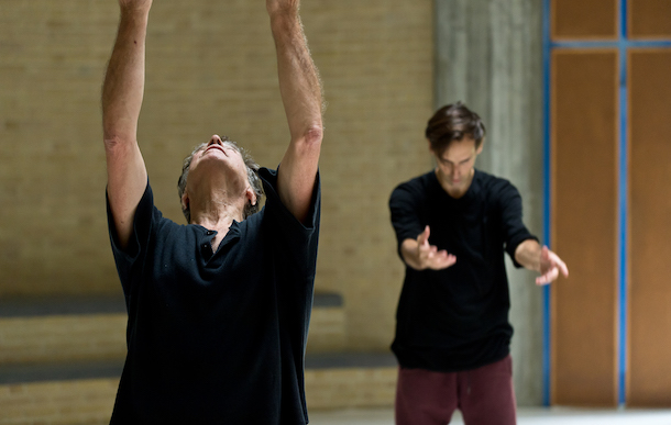 On se passionnait donc pour cette recherche vivante, animée dans un corps dont l'usure ne doit sans doute pas rien aux morsures de la danse. Un corps aujourd'hui en train d'adapter son geste, ses ressources, ses articulations, pour faire face à la difficulté. Il ne manque pas de difficultés dans Parallèles. Ce titre peut suggérer la mise en regard des deux hommes qui s'y présentent (leurs histoires et parcours respectifs). Subrepticement, il fleure aussi la référence à la danse classique et ses positions canoniques.