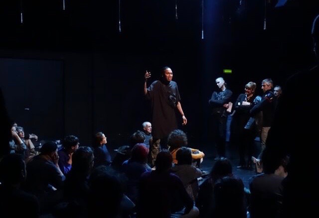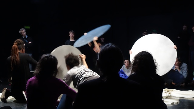 L’idée de décolonisation s’applique ici aussi aux spectateurs qui sont invités à rejoindre les performeuses en circulant librement dans l’espace. Mais ils peuvent aussi monter dans les gradins pour avoir une vue d’ensemble. Le renversement total du rapport frontal et immuable fait sens pour ce spectacle et est d’autant plus à saluer que la France accuse un manque endémique de propositions envisageant un autre rapport entre les interprètes et les spectateurs.
