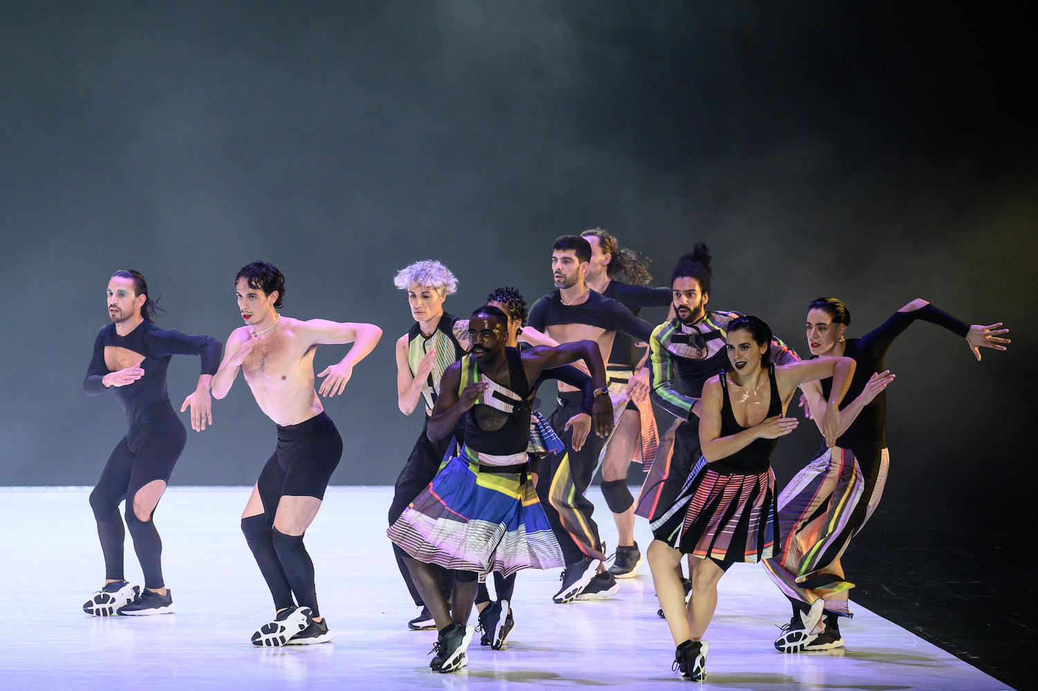 C’est un tourbillon qu’orchestre Marco da Silva Ferreira, où gestes, musique, lumières et costumes produisent de la dopamine à forte dose. Le chorégraphe portugais déploie un vocabulaire inventif où les jeux de jambes du voguing et de la house coexistent avec des mouvements issus des danses folkloriques. Les dix interprètes entrent et sortent du plateau, variant les combinaisons chorégraphiques et changeant de costume à vue.