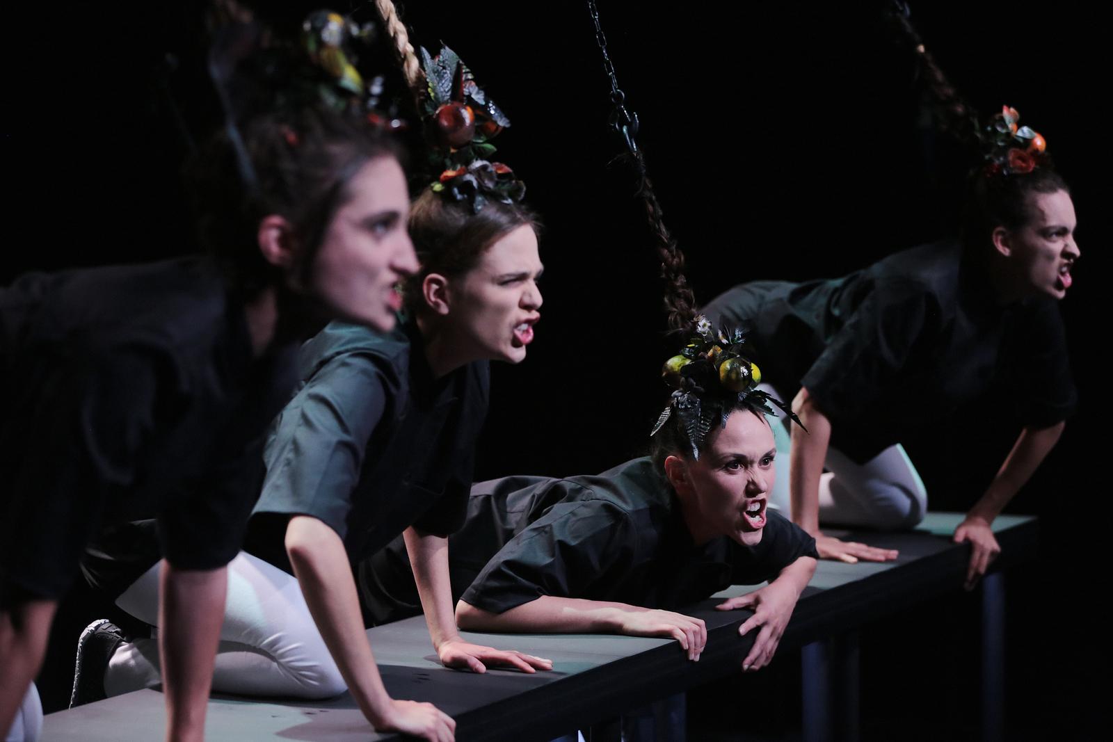 Ce sont là de nouvelles voix féminines qui inventent de nouvelles voies. Comme Flora Détraz avec Muyte Maker, entre tableaux grotesques et chansons triviales. Les cheveux de la femme sont un symbole de sensualité, de séduction ou de rébellion. Ça dépend de leur longueur, de leur couleur etc. Dans Muyte Maker, ils servent à transformer les quatre danseuses-chanteuses-comédiennes en marionnettes et presque en prisonnières. Dans leur polyphonie musicale et gestuelle se pose sans cesse la question ; Manipulent-elles ou sont-elles manipulées ?