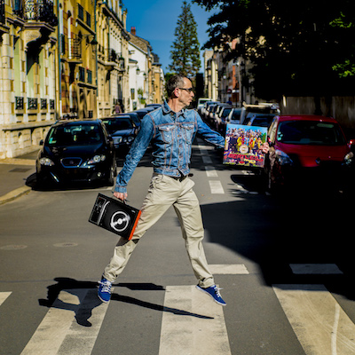Un stand de DJ, avec platine et pile de disque, un projecteur pour les pochettes des albums qu’au fil de sa fantaisie il vient choisir dans la pile de ses amours musicales. Il tâtonne à mettre lui-même les vinyles, hésite sur l’ordre de passage et sur les enchaînements. Allez, commençons par les Carpenters, avant Elvis Costelo ou les Beatles. Toujours des extraits, à même l’album original, agrémenté de commentaire en forme d’autobiographie dérisoire et support d’une danse qui n’oublie jamais de se moquer d’elle-même.