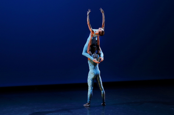 Adagietto d’Oscar Aráiz, ainsi nommé car dansé sur le quatrième mouvement de la symphonie N° 5 de Gustav Mahler, est un duo sensuel, jouant sur le ralenti et un mystérieux état d’impesanteur. Mettant en scène Maëva Cotton et Alessio Passaquindici devant un fond bleu, Vu-An accentue les sensations aquatiques qui se dégagent ici d’une danse capable de faire exister l’élément naturel entourant les corps. Cette faculté est reconnue comme étant l’apanage d’un Saburo Teshigawara, quand il s’agit d’air et de vent.