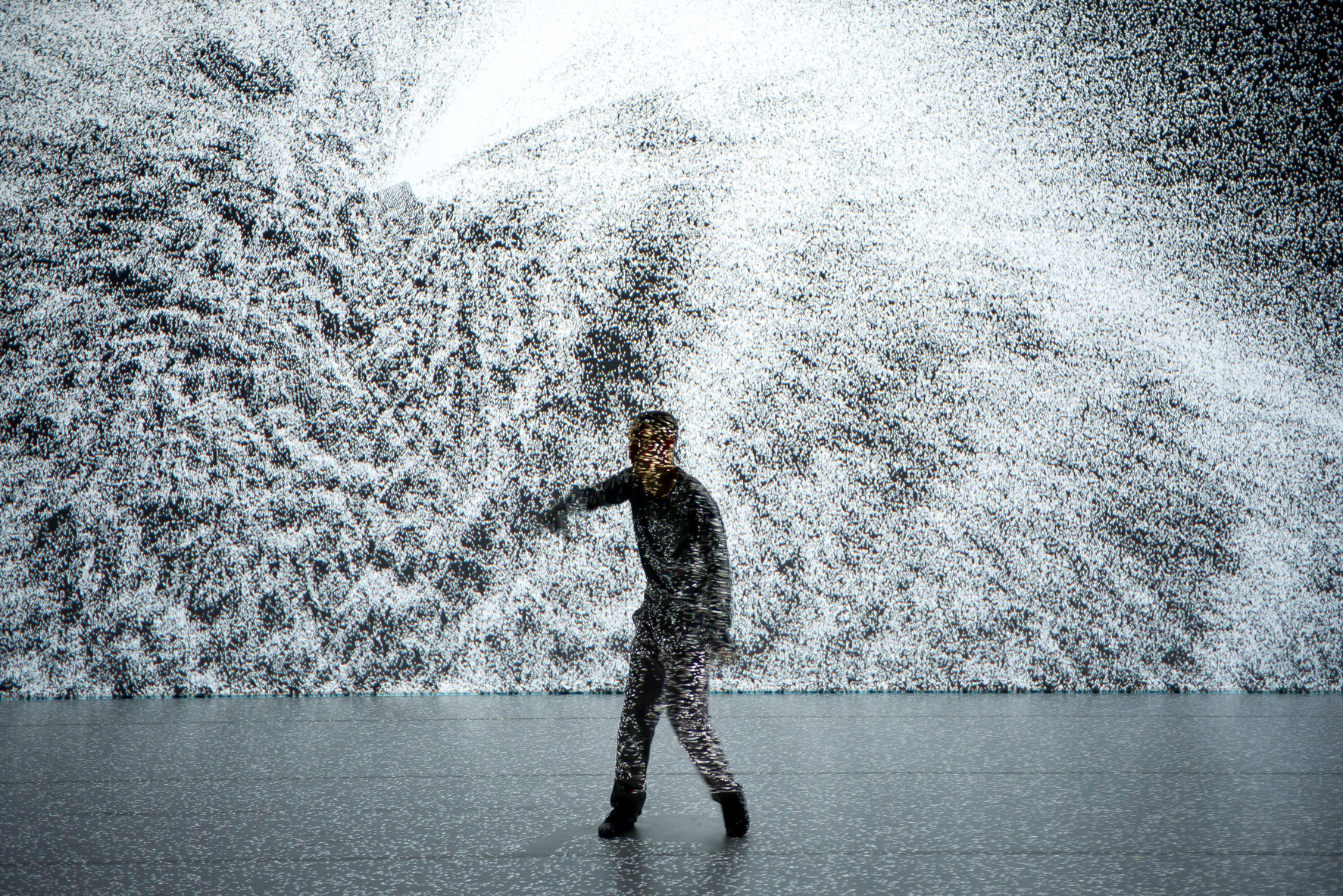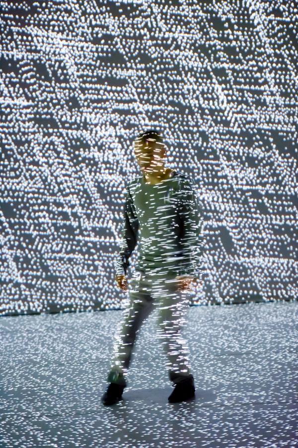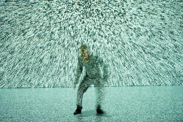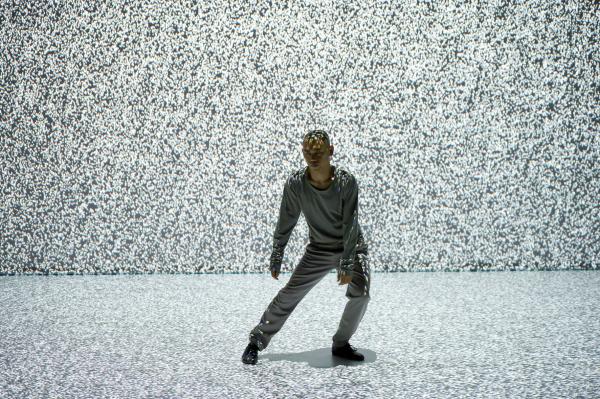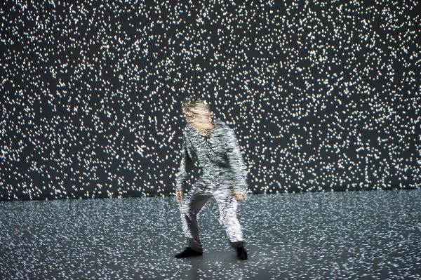Chez Hiroaki Umeda, qui dit de lui-même qu’il est un artiste visuel plutôt que chorégraphique, le corps est souvent poussé aux limites de sa présence naturelle et physique. C’est excitant sur scène, mais fonctionne tout aussi bien comme image à l’écran, grâce à la qualité graphique extraordinaire des projections qui sont sa signature si personnelle, et questionnent le corps et son équilibre. L’image n’y écrase pas le corps, elle le met en état de vertige. Umeda est comme emporté par les séismes graphiques et se fond dans les vagues. Son corps devient dessin, se dissout parfois, revient à une présence charnelle et terrestre, et disparaît à nouveau dans les flux graphiques. Et tout cela l’amène à redéfinir l’espace scénique, ses dimensions et sa réalité. Quand le corps sur scène est aussi irréel et amorphe, les enjeux sont au moins aussi graphiques que charnels et l’écran plat devient leur territoire naturel.