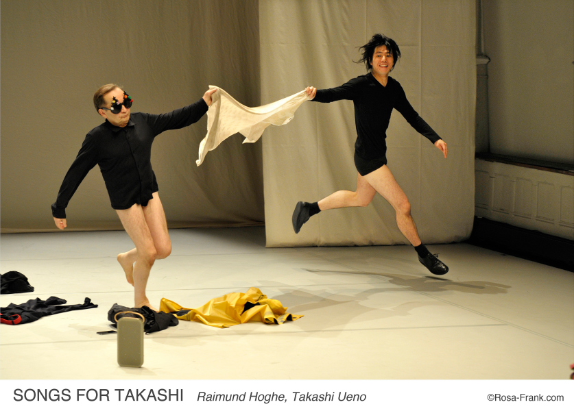 Dans Pas de deux, duo créé en 2011, Raimund Hoghe et Takashi Ueno mettaient en scène leur rencontre, se découvrant des similitudes étonnantes. Songs for Takashi pourrait en être la suite, où ils envisageant désormais leur relation sous l’angle bienveillant de la différence amicale. Toujours aussi complices, mais avant tout complémentaires, Ueno et Hoghe exploitent au maximum leurs contrastes morphologiques et énergétiques, à la manière de certains grands duos d’artistes, tels Laurel et Hardy.