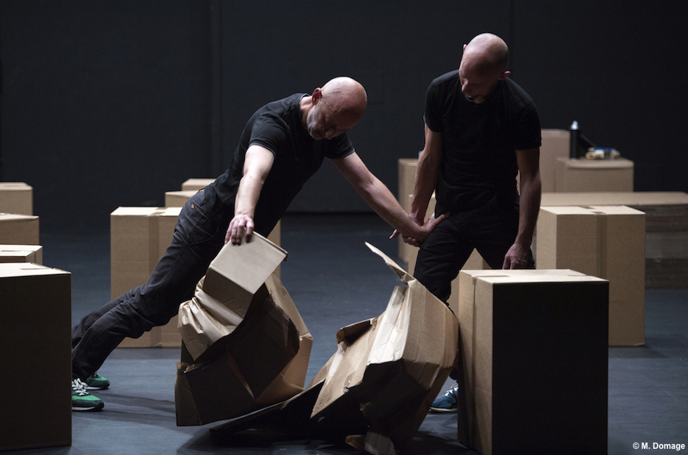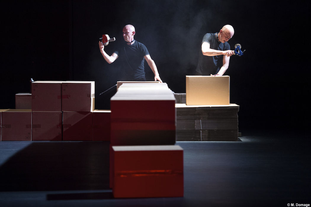 La déshumanisation au travail, dans les grandes plateformes de distribution, est le point de départ de Refuge. Et bien sûr, ces cartons. Pendant que Dupont et son collègue (Raphaël Dupin) - on pourrait parler de clone - en fabriquent environ quarante, la machine bien huilée de leurs gestes se dérègle quelque peu. Les bugs se multiplient et il faut à chaque fois « réinitialiser » l’homme-machine qui a dérapé. Mais le processus de ré-individuation est enclenché, et plus rien ne l’arrêtera. Refuge est aussi une pièce sur la révolte.
