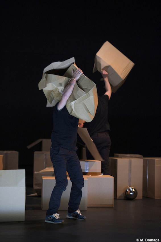 On songe ici aux deux dernières créations de Maguy Marin et à sa critique du capitalisme déchaîné. D’une part, grâce aux quarante boîtes qui forment deux lignes droites traversant ce hall industriel imaginaire, rappelant le mur construit dans Deux Mille Dix Sept. On pense aussi à Ligne de crête, où les bugs gestuels se produisent au son assourdissant de la photocopieuse.