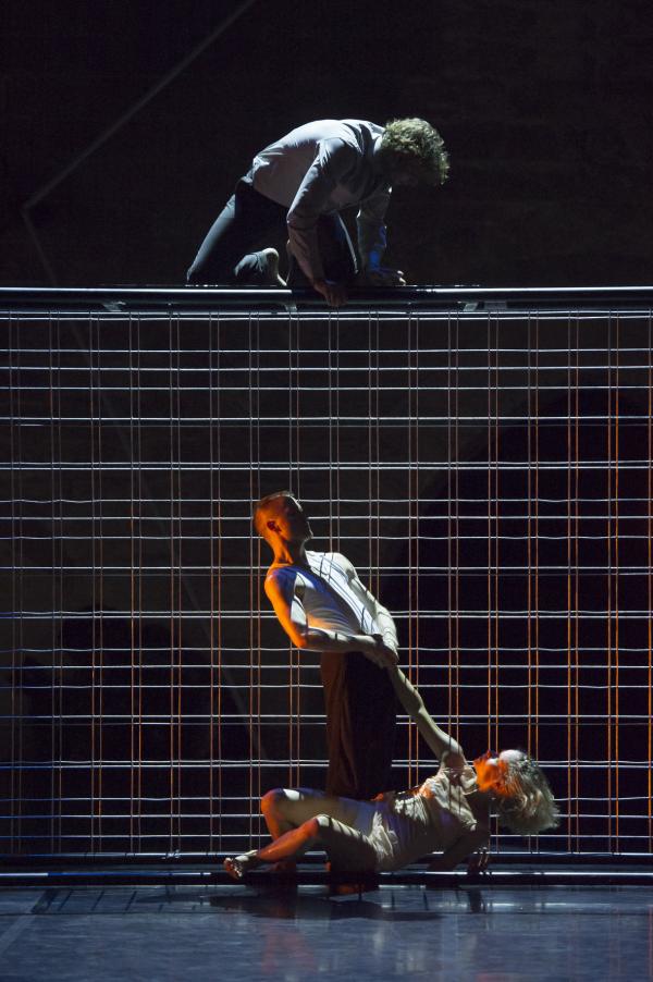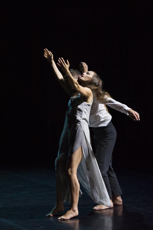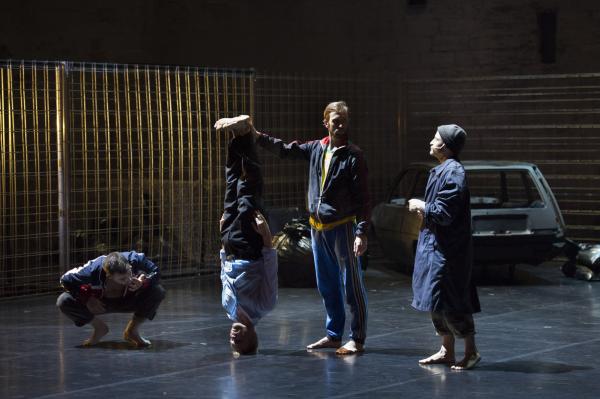 Les acteurs (Laurent Cazanave et Niels Schneider) portent le texte sans endosser un rôle précis, mise à part la mère de Katja (Emma Gustafsson, ancienne danseuse du ballet par ailleurs), Laurent Mauvignier n’ayant pas écrit son récit sous une forme théâtrale. Le texte devient donc matière sonore qui déroule une histoire dont le temps se téléscope. Ils la disent plutôt simplement. Flash-back, dialogues au présent, zoom sur un événement constituent une trame complexe qui fait avancer l’action – à savoir la danse, qui ajoute et plus rarement commente ce qui finalement tient lieu de livret. Elle joue l’inconscient, le non-dit, met au jour des zones d’ombres que la parole ne saurait fouiller.