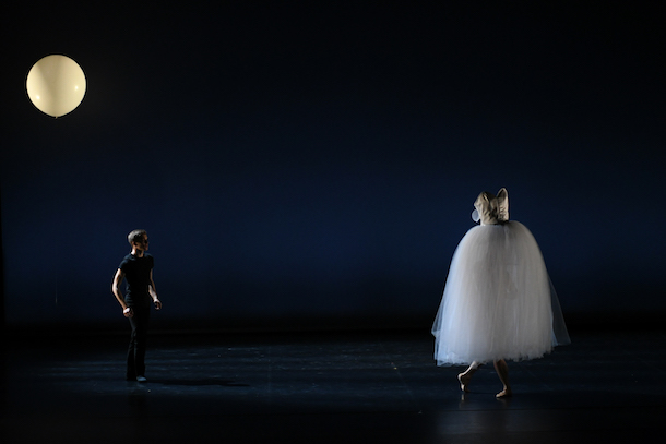 Puis une nouvelle courte pièce de Thierry Malandain pour vingt-deux danseurs et toujours sur la musique de Chopin, Rêverie Romantique met en scène la Sylphide. Au tout début, des danseurs vêtus de noir maintiennent d’immenses ballons de baudruche blancs. Ils les éclatent tous sauf un qui s’envole et reste suspendu en l’air. Puis, un très long tutu romantique apparait juché en hauteur soutenu par un homme dont seules les jambes sont visibles.