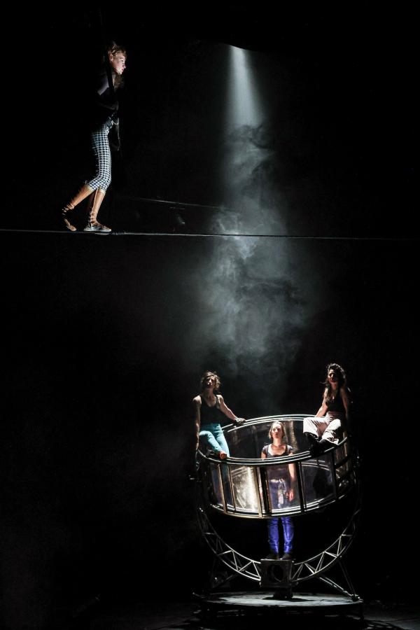 Au plateau, une bande de cinq filles rock & roll en grande forme : chanteuse et musicienne, danseuse aérienne, acrobate et fildefériste. En point fixe à cour, une roue, pas une élégante et incontournable Cyr, mais une innovante roue giratoire comme un grand rouleau, magnifique conception métallique dans son design mais objet infernal dans sa symbolique. Coincée dedans, une femme coure inexorablement et explore en tous sens les contours et les possibles issues sans jamais réussir à avancer ou à en sortir, tel un hamster. Métaphore de l’impossible, l’image vient s’incruster en contraste et de façon récurrente dans la dramaturgie, les deux autres Renardes évoluant exclusivement dans les airs. Harnachées de baudriers celles-ci ne touchent quasiment jamais terre. Elles montent des murs imaginaires, flottent dans les airs, nagent à dix mètres de haut, en verticale, en biais, à l’horizontale… défiant tout repère rationnel d’espace. Saluons au passage les concepteurs et machinistes pour ce colossal travail de l’ombre.