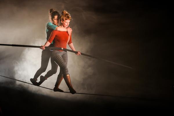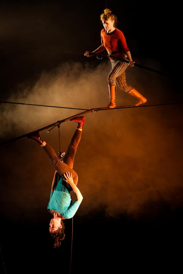 Johanne Humblet, déstructure son fil sans cesse et d’une manière qui lui est propre, elle crée des perpendiculaires, grâce à son immense balancier qu’elle place en croix et qui projette parfois les filles du bas vers le haut et vice versa … dans ce dispositif les Renardes jouent avec le reflet, le recto-verso, semblant marcher à l’envers, solidaires dans un équilibre toujours précaire. En solo, superbe moment où elle avance dans un ciel noir et tourmenté, Johanne Humbelt appréhende son fil, non par le bout des pieds ou par petits glissements, mais de manière plus martiale, nous surprenant avec de grands pliés seconde où elle se trouve en position latérale au fil.