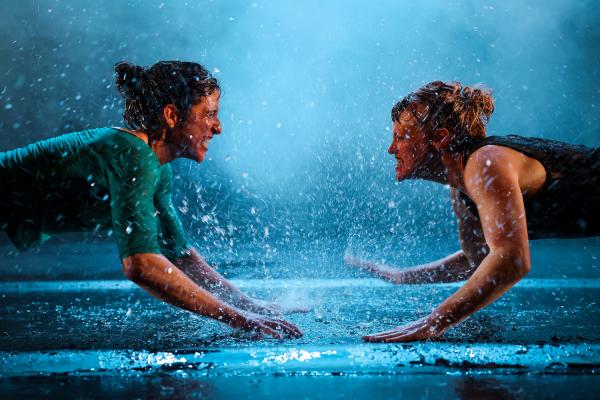 Beaucoup d’images puissantes, oniriques, un filet géant – un piège – de grandes volutes de vapeur d’eau, des lumières de nuit et de crépuscule, (superbes éclairages conçus par Bastien Courthieu et Clément Bonnin) du vent et de la pluie, autant d’éléments impressionnants et peu confortables pour des équilibristes. Soudain, arrive une scène de combat décalée, à peu près le seul moment où la danseuse et la fildefériste touchent terre, mains griffues, postures animales, vols et envols planés ou verticaux, évoquant aussi bien l’univers manga que le kung-fu volant de Tigre et Dragons.