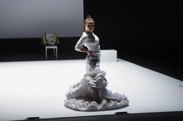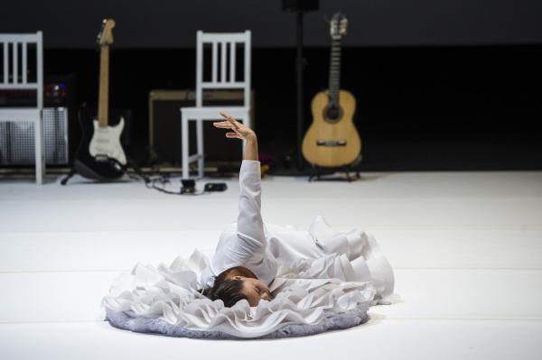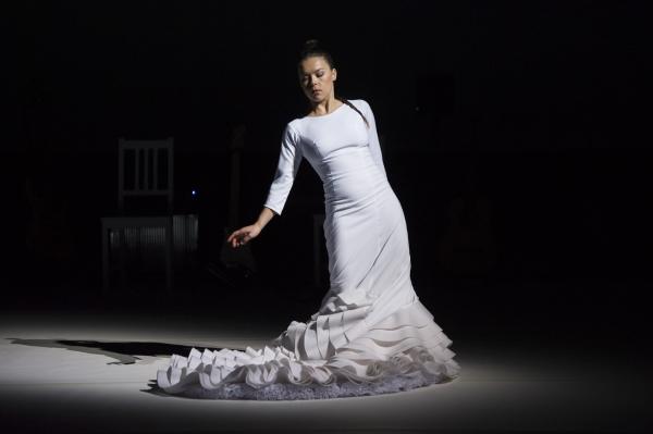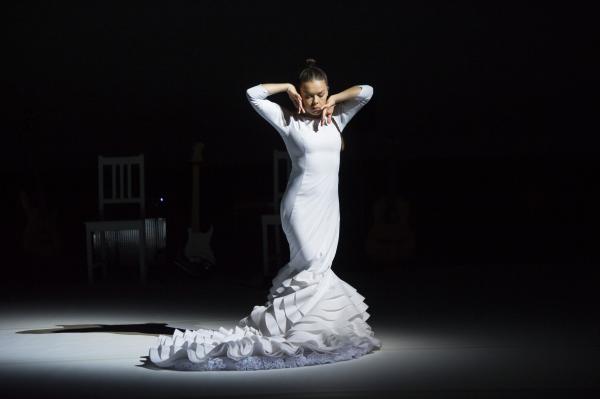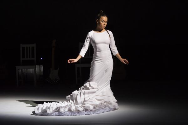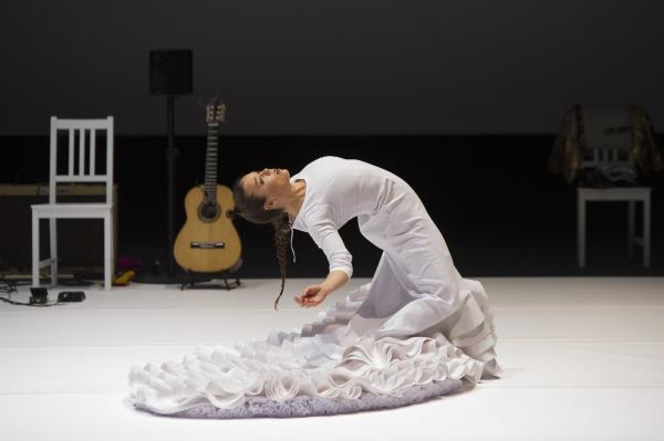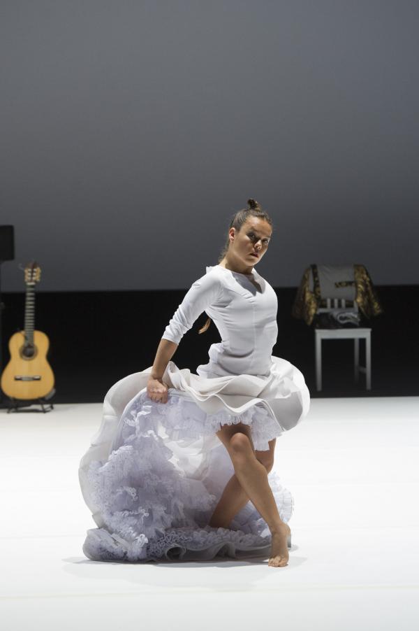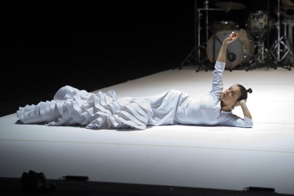 Caída del Cielo démarre comme dans un rêve. Rocio Molina, dans une robe très stylisée de flamenco immaculée Avec ses mouvements d’ondoiements presque immobiles, elle ressemble à une petite statue d’albâtre « tombée du ciel ». Peu à peu, elle fait passer à travers son corps et ses bras des pans d’une histoire de la danse qui serait digérée, remaniée, passée par le filtre du flamenco. Cygne à l’agonie, blancheur butô, et images enfouies. Petite, enfantine, ramassée sur elle-même, et bientôt nue, comme une Eve d’hier et d’aujourd’hui.