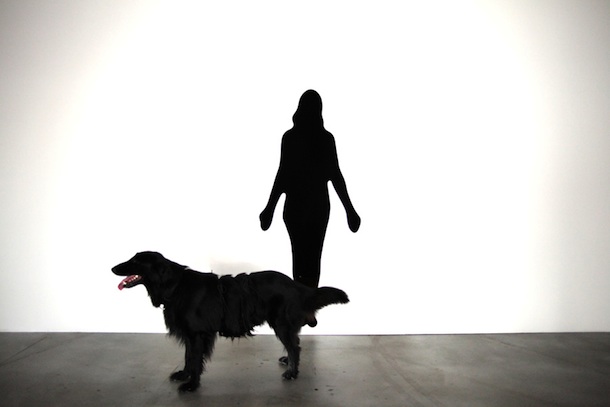 Le public se trouve dans une boîte fermée, et malgré le sol blanc nous devinons qu’il s’agit de la camera oscura. Un énorme chien noir se balade au sol, s’assoit, se laisse caresser et émet les réflexions sonores de la caméra, en dialogue avec la Lumière. Au spectateur s’offrent trois perspectives. En haut, l’énigme de la suspension. Au sol, le chien noir dans le rôle de la Caméra. Et devant, le trou de serrure, silhouette de la femme-lumière, ouvrant sur du noir depuis la boîte blanche. Le public entre et sort par ce trou et entretemps, observe les corps de six femmes, d’abord en chemises de nuit blanche, et finalement enchevêtrées, nues.