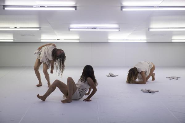 Dans toute cette première phase de Saison sèche, les sept interprètes féminines divagient en-dehors de toute fixité (mais notons qu'elles garderont toujours un formidable niveau d'implication individuelle et collective ; c'est à saluer, c'est l'une des forces de cette pièce). Ni même leur station debout ne relève de l'évidence. Qu'une ronde se forme, et une houle la vient faire tanguer. Leur tenue vestimentaire intrigue, qui les habille sans les "protéger" de la nudité.