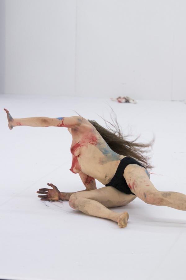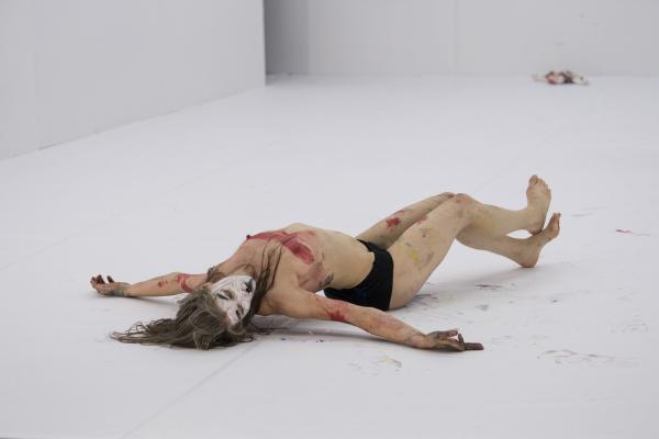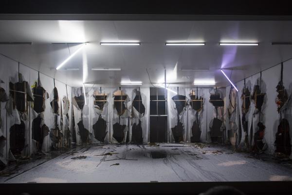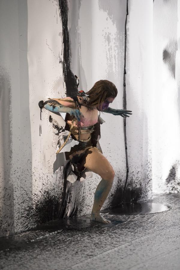 Enfin, le troisième grand tiers consiste en l'effondrement, interminable et ronflant, de l'ensemble du cadre scénique, à la façon d'un carton pâte cédant sous le déversement de tonnes d'eau. Cette démesure des moyens était déjà le propre de Belle d'hier, puis des Os noirs, précédentes pièces de Phia Ménard. On discerne bien ce que l'ex-circassienne cultive alors, pour établir un lien entre la matière des corps – capables de toutes les métamorphoses, changement de sexe compris – et plus largement la matière du monde, en proie à tous les soulèvements.