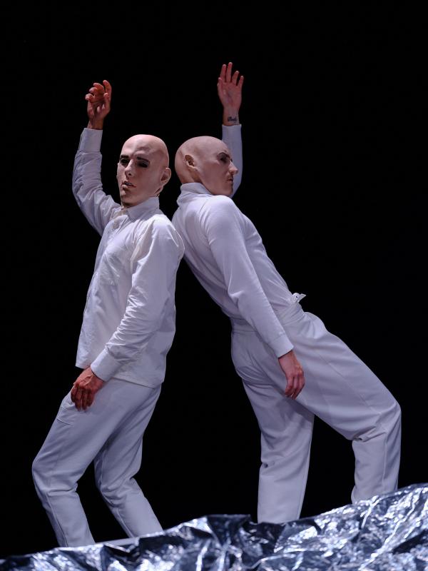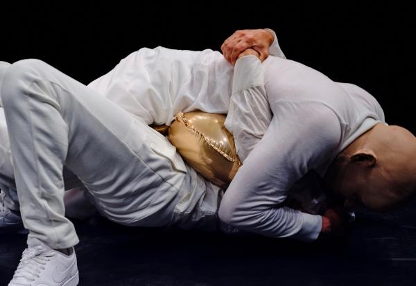 C’est aussi un questionnement sur ce qui est inerte, vivant, conscient, inconscient… « Parfois, quand nous faisons éclater un ballon, un autre descend du plafond, comme pour s’inquiéter de son camarade », raconte le chorégraphe. Ce trouble fait toute la beauté et le sens de ce duo en dialogue avec les arts plastiques. Car ainsi hissés au rang de partenaires chorégraphiques, les ballons font œuvre, face à deux danseurs-acteurs au geste sculptural et ciselé, semant le trouble jusque dans leur dialogue à visages masqués, où se confondent bienveillance et violence. Et une fois de plus, le chorégraphe suisse, dernièrement vu avec Ether [lire notre critique] nous surprend avec une idée scénographique et dramaturgique parfaitement inattendue, mais a indéniablement de la suite dans les idées, quand il passe ainsi de l’éther à l’hélium…
