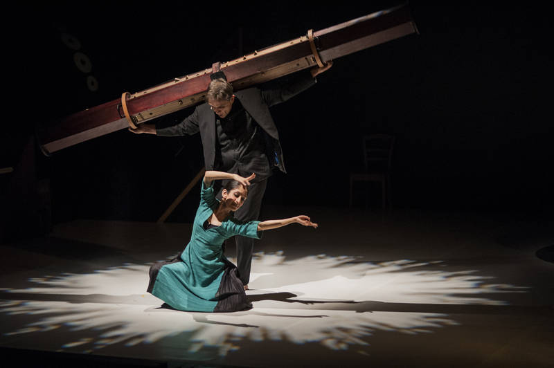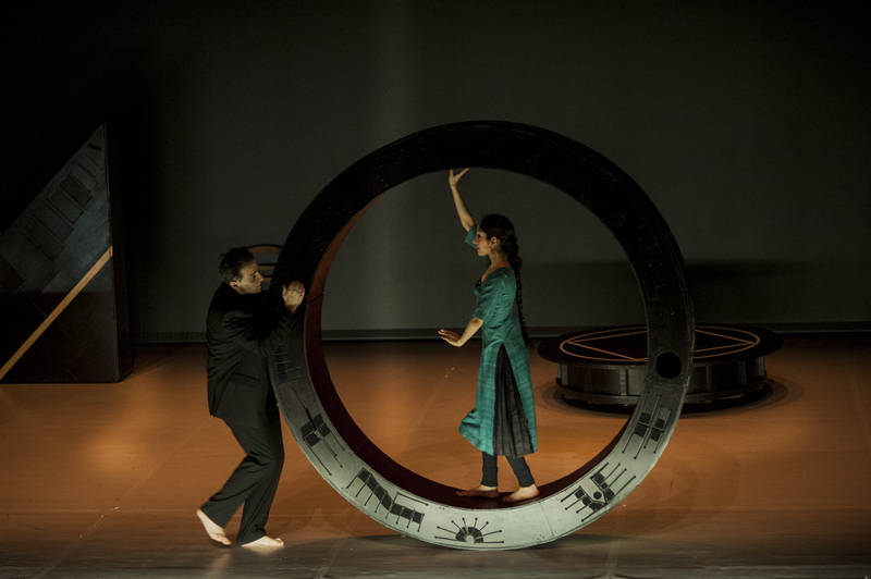 Roland Auzet crée ses instruments de musique sur mesure. Dans Sama, ils ne sont pas des instruments, mais une scénographie spectaculaire et active: Un bâton de pluie haut comme un homme, des caissons triangulaires qui finissent par former un plateau (un vrai jeu de Tangram), une énorme roue pleine de surprises acoustiques dans laquelle Arushi Mudgal peut se déployer telle une circassienne dans sa roue cyr...