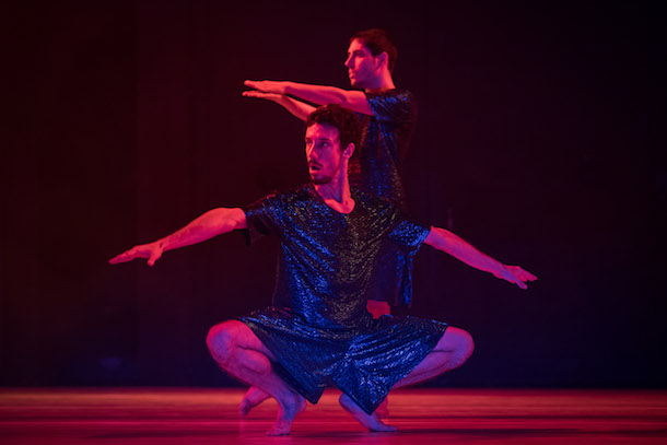 Sur scène, deux danseurs, le chorégraphe Andrea et Avidan Ben-Giat exécutent de petits déhanchements sous un rond d’éclairage. Mais l’un veut être mis en lumière, donc pousse l’autre…. Alors que l’autre refuse l’ombre. S’ensuit une compétition qui se dessine entre sourires forcés, grimaces et positions de stars. C’est fin et tellement bien joué que le rire explose déjà dans la salle.