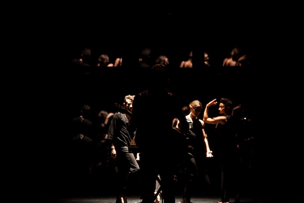 Est-ce vrai, est-ce faux ? La relation entre les corps et le son pourrait être comparable à celle de la motion capture, où les capteurs activent les algorithmes d’une banque de données sonore ? Au bout du compte, la direction dans la chaîne cause-effet importe moins que la sensation d’un réel échange entre créateurs. Et ça fonctionne, les cinq créent une relation vivante. Aux limites de la fusion, engagés dans des ralentis aux limites du maîtrisable (où l’ombre de Myriam Gourfink pointe son nez), investissant une verticalité fluide et sensuelle, les corps ondulent longuement sans se déplacer dans cet écrin, comme vêtus de satin noir.