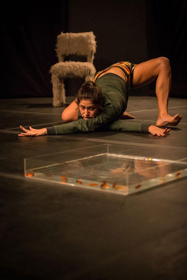 Le solo d'Alice Ripoll, interprété par l'acrobate Camila Moura, se déroule dans l'univers apaisant et réconfortant d'un lieu de vie harmonieux, avec ses poissons rouges, ses fleurs et une chaise qui fait animal de compagnie. Dans cette maison parfaite, la Brésilienne est allongée au sol comme pour se détendre. Mais à son bien-être apparent s'opposent ses contorsions corporelles, traduisant des distorsions intérieures. Et l'étrangeté ne fait que grandir quand Moura se tient, la tête vers le bas, dans la bassine carrée, au plus près des poissons.