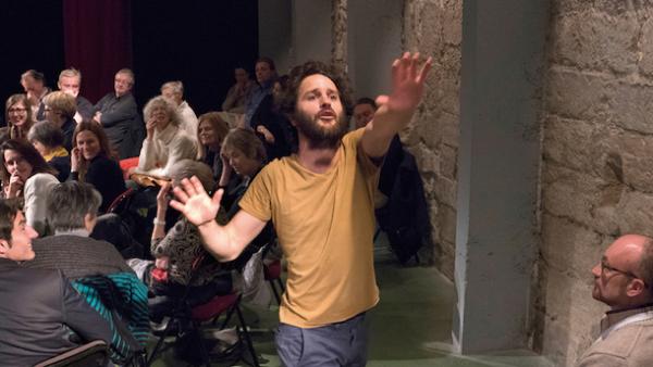 Sur le plateau de la grande salle du Quai d’Angers Simon Tanguy s’est lancé dans un tourbillonnant monologue devant un public constitué uniquement de jeunes. Inging est inspiré d’une version pré-existante dont le concept et l’idée ont été imaginés en 2010 par Jeanine Durning, chorégraphe newyorkaise dont le travail est axé majoritairement sur la performance. Ainsi, la tâche de Simon est de parler de tout et n’importe quoi sans s’arrêter pendant 45 minutes. D’un mot il rebondit sur une autre intention tout en se mouvant subtilement entre les spectateurs et surtout en n’hésitant pas à les prendre à témoin. Cet exercice de style très périlleux à exécuter présente quelques faiblesses bien qu’il soit évident que le jeune homme désire rassembler humour, contact et partage.