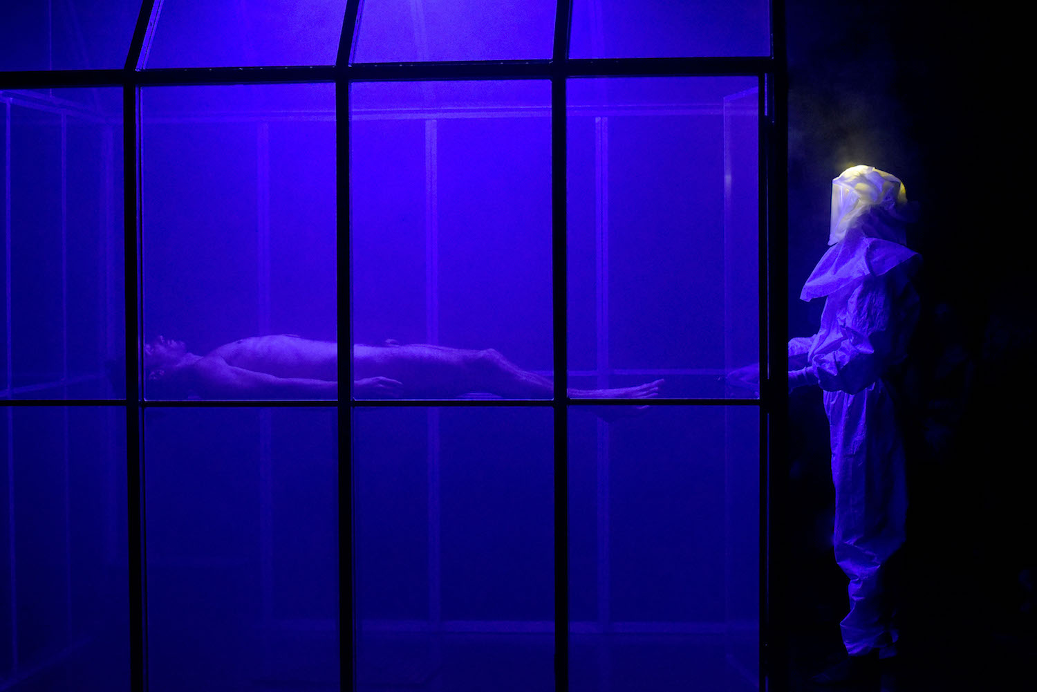 Revendiquant ouvertement ses références aux films fantastiques (on ne peut s’empêcher de penser à La Mouche de David Cronenberg), Martin Harriague a en effet redessiné la salle où prend place le public en véritable boîte noire, au centre duquel est installée une mini serre horticole. A l’intérieur, telle une espèce menacée ou menaçante, un être humain est conservé, régulièrement ravitaillé et contrôlé par une forme fantomatique entièrement couverte d’une combinaison blanche, bruitages de respiration sous bouteille d’oxygène à la clé.